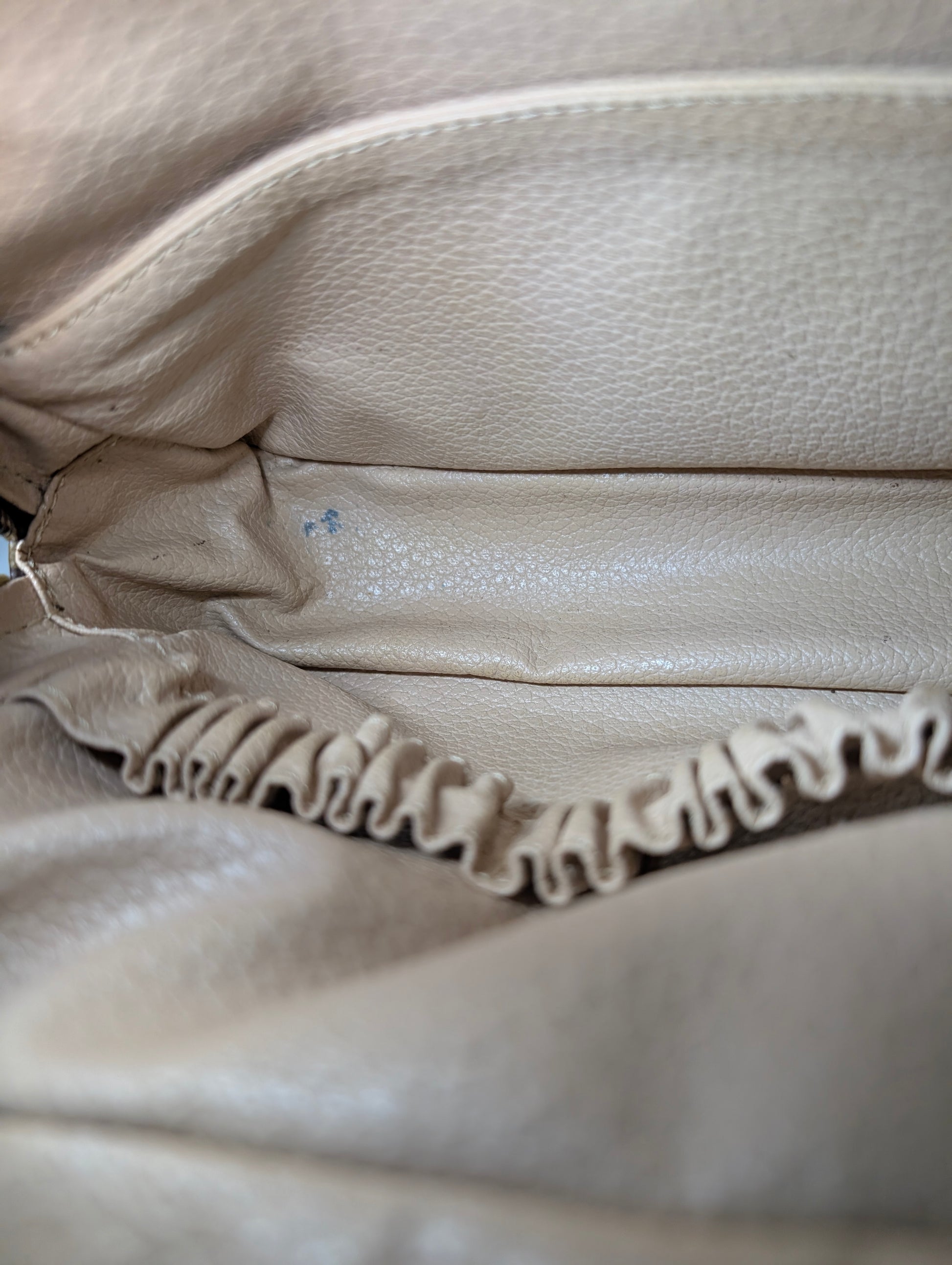 Details: L 23 cm H 15 x D 6.5 cm. The zipper has a tear hence the pruce. Interior has some marks. Made in France 1982